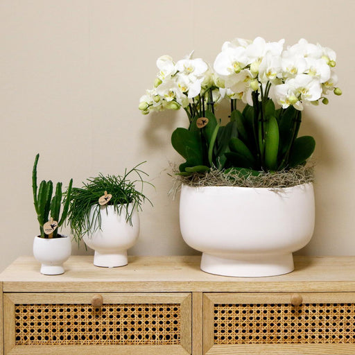 Alle gegevens bekijkenWitte orchidee Amabilis en succulent in Tube sierpot wit - Set - Ø9cm | bloeiende kamerplant