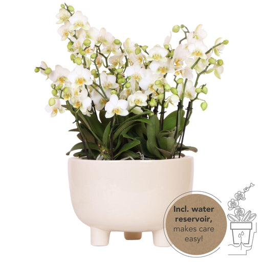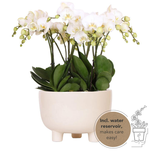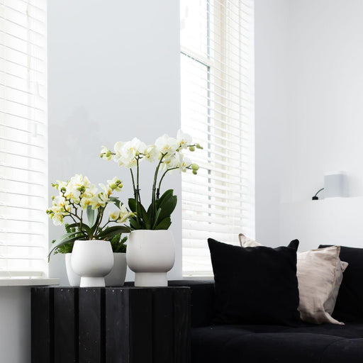 Witte phalaenopsis orchidee - Lausanne + Scandic witte sierpot - Ø9cm + ↕40cm - Bloeiende kamerplant
