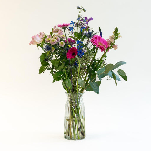 Boeket in roze, paars en blauwtinten. Lengte van de stelen zijn ongeveer 50cm. Dit boeket is voorzien van een zakje snijbloemenvoeding met verzor...
