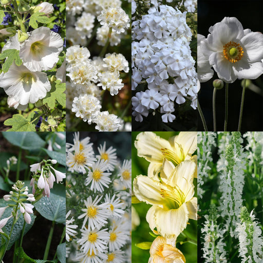 """Creëer rust en elegantie in je tuin met ons borderpakket Wit. Dit pakket bevat 8 verschillende vaste planten met witte bloemen die zorgen voor e...