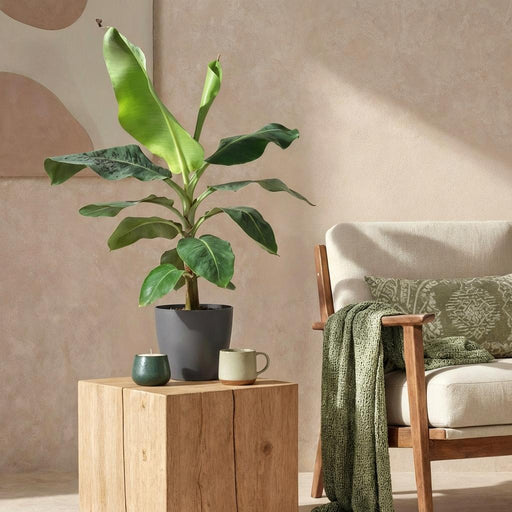 Musa acuminata Dwarf Cavendish is een prachtige kamerplant die niet alleen een vleugje groen aan je interieur toevoegt, maar ook een tropische sfee...