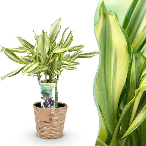 Alle gegevens bekijkenDracaena fragrans Diamond Dream - Drakenbloedboom - met mand - Pot 17cm - Hoogte 50-55cm