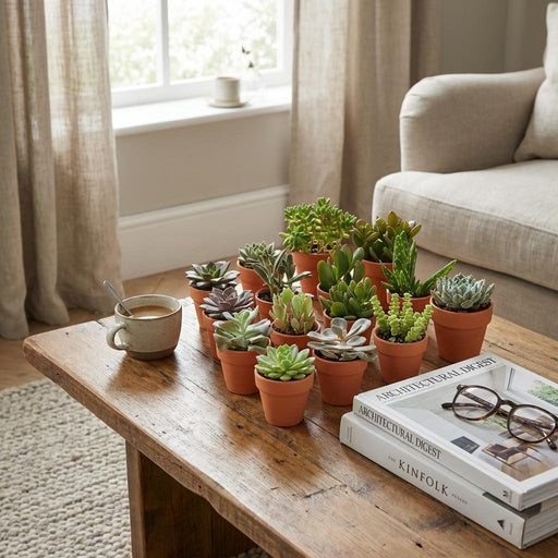 Een gevarieerde mix van vetplanten, elk geplaatst in een sfeervolle terracotta pot. Deze planten zijn ideaal voor de vergeetachtige gieter, want ze...