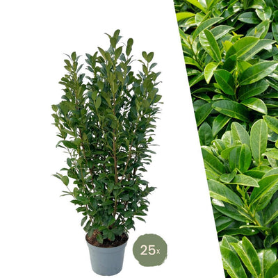 Vollständige Details anzeigenGroßer Kirschlorbeer 'Rotundifolia' für eine 10 Meter lange Hecke - 12L - 25x - ↕100-125 cm